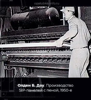 Фанера и картон не давали достаточной теплоизоляции, поэтому впоследствии ученик Райта Олден Б. Доу, между торцами фанеры включил сердечник из пенополистирола (EPS). Олден Б. Доу, брат основателя Dow Chemical Company (кап. $70 млрд, в России с 2003), создал первую SIP-панель с сердечником из вспененного материала в 1952 г.